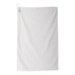 Carmel Towels 15" x 18" Microfiber Golf Towel With Grommet. Serged edges. Silver corner grommet and hook. Flat-faced microfiber front for easy embellishment. 0.8 lbs per dozen. Non-branded label/tag.